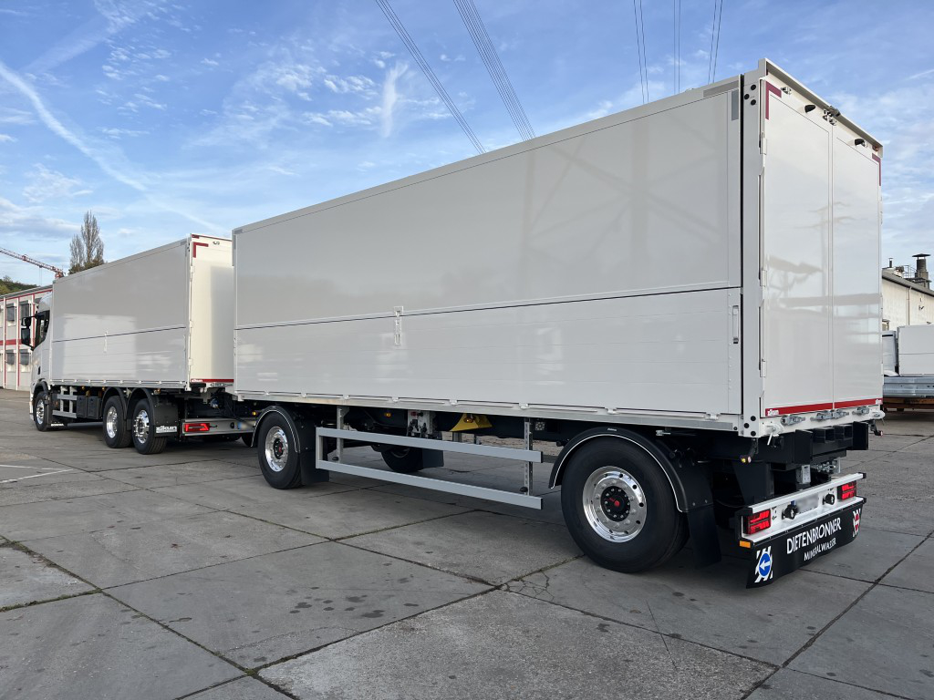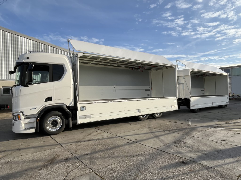 - Geschlossener Aufbau, festes Alu-Dach, Alu-Klappwand unten, Klappwand oben aus speziellen Alu-Verbundplatten, glatte Werbefläche