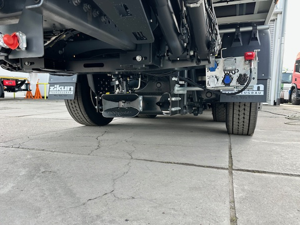 | Aufbau: | ZIKUN Klappenschwenkwerk (Swing-Board I) beidseitig, Heckportal mit BÄR-Ladebordwand 2.000 kg, Ameisenkasten rechts, Aufbaumaße i. L.: 7.700x2.200 mm, Tiefkuppelsystem für Zentralachsanhänger |