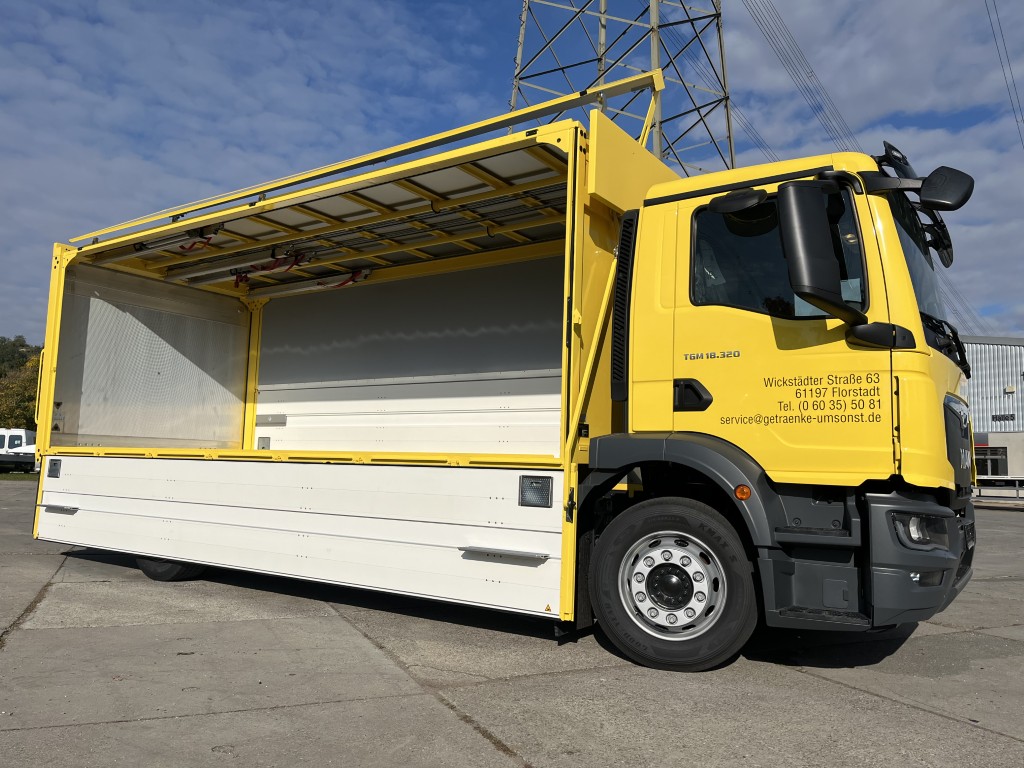 - Geschlossener Aufbau, festes Alu-Dach, Alu-Klappwand unten, Klappwand oben aus speziellen Alu-Verbundplatten, glatte Werbefläche